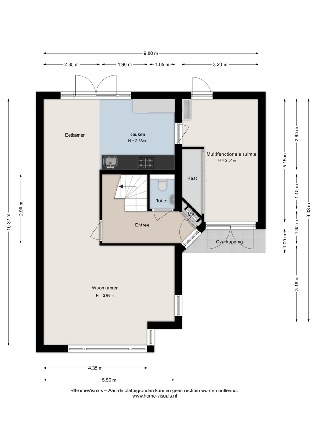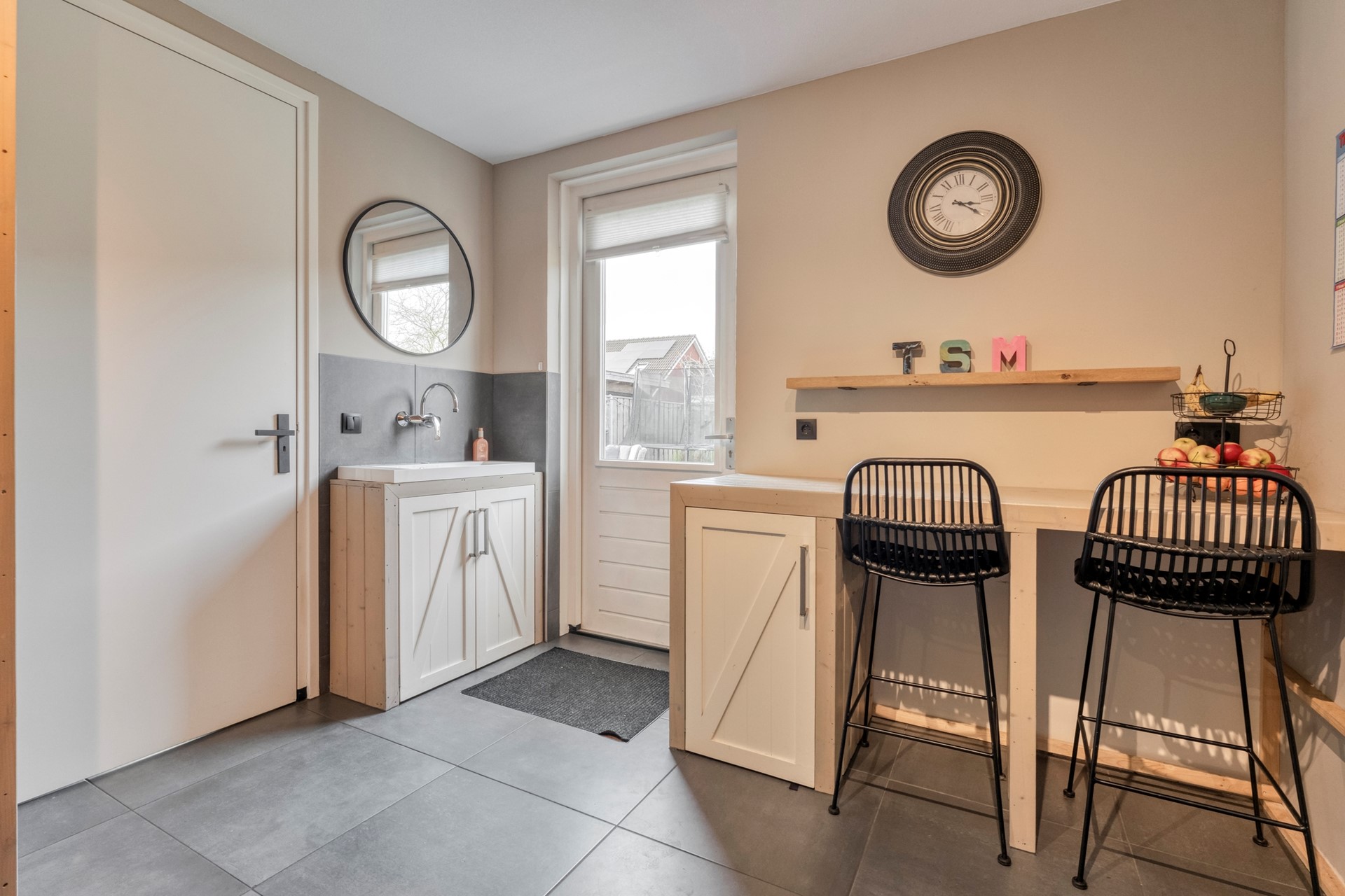 Begane grond: hal/entree, toilet, woonkamer, keuken, bijkeuken/multifunctionele ruimte met kastenwand.