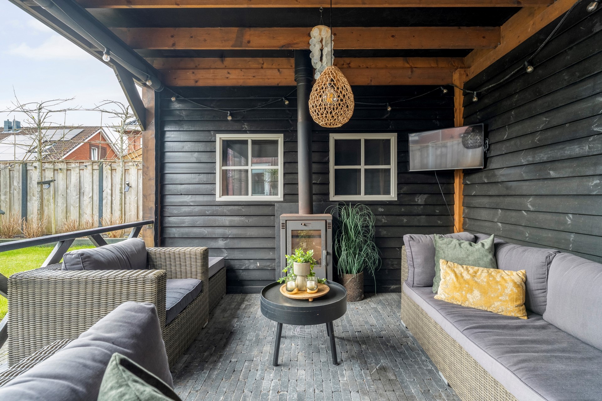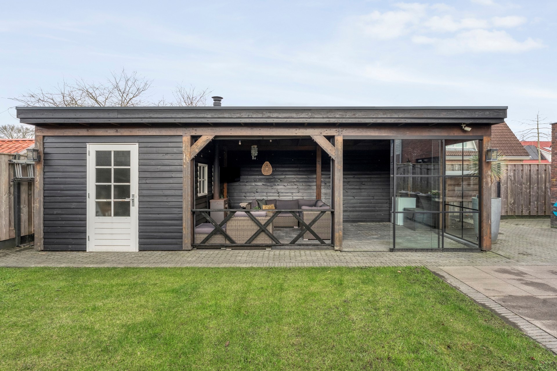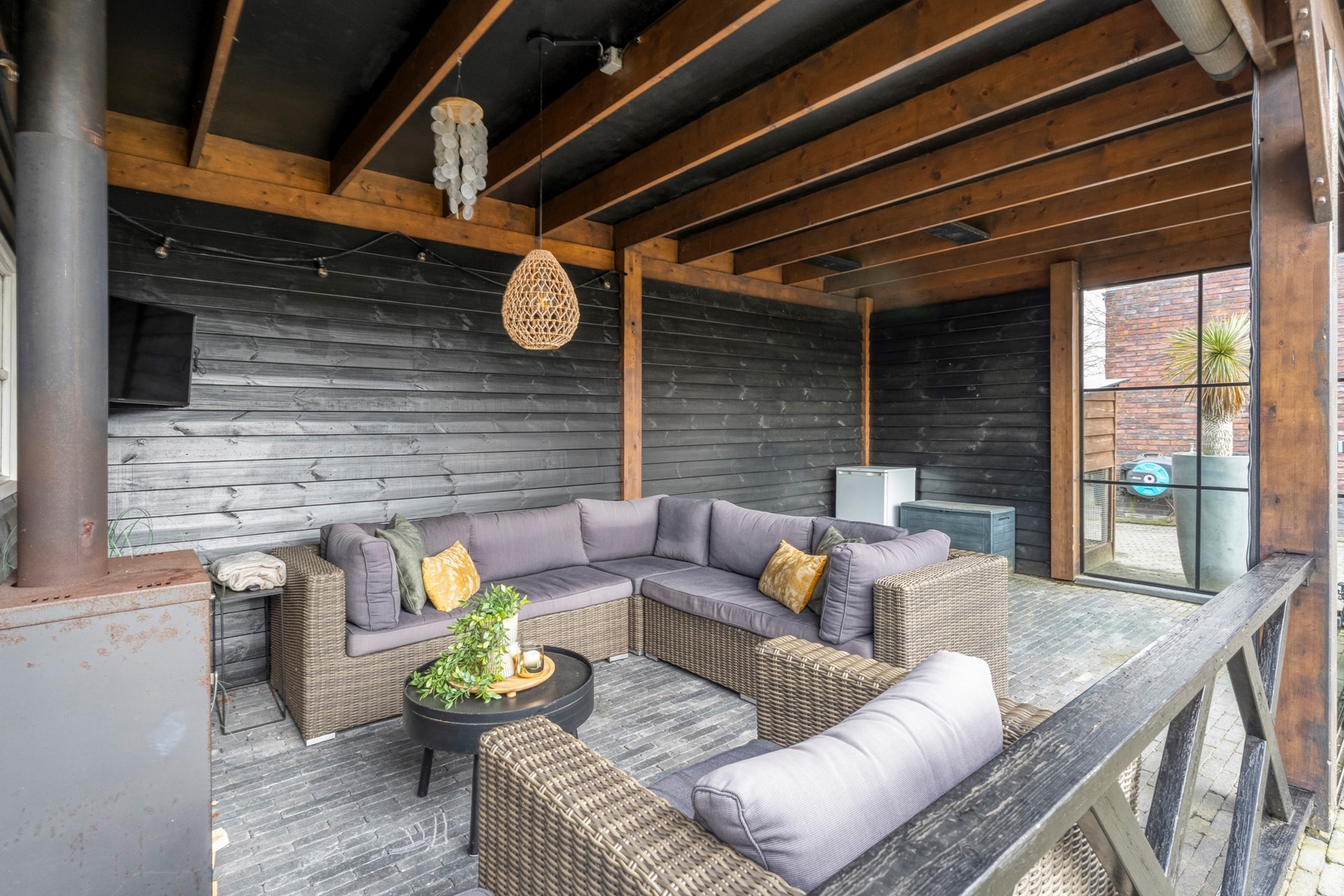 - Fraai tuinhuis van 9,60 m lang en 3,60 m diep met inpandige berging en houtkachel