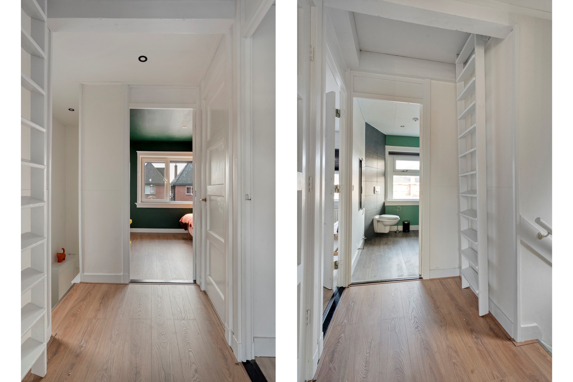 Verdieping: overloop, badkamer, twee slaapkamers en de voormalige badkamer/opbergruimte